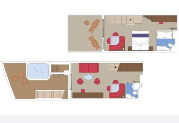 | YJD - Yacht Club Duplex Suite s vírivkou 46 m² + balkón 30 m². Vírivka. 2 podlažia, šatník, 2 kúpeľne (1 s vaňou). Max 4 osoby. 16. paluba. Cenový model MSC Yacht Club. | 10 452 € 3 484 € za osobu |