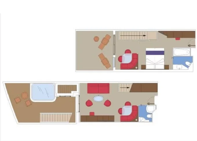 | YJD - Yacht Club Duplex Suite s vírivkou 46 m² + balkón 30 m². Vírivka. 2 podlažia, šatník, 2 kúpeľne (1 s vaňou). Max 4 osoby. 16. paluba. Cenový model MSC Yacht Club. | 8 242 € 4 121 € za osobu |
